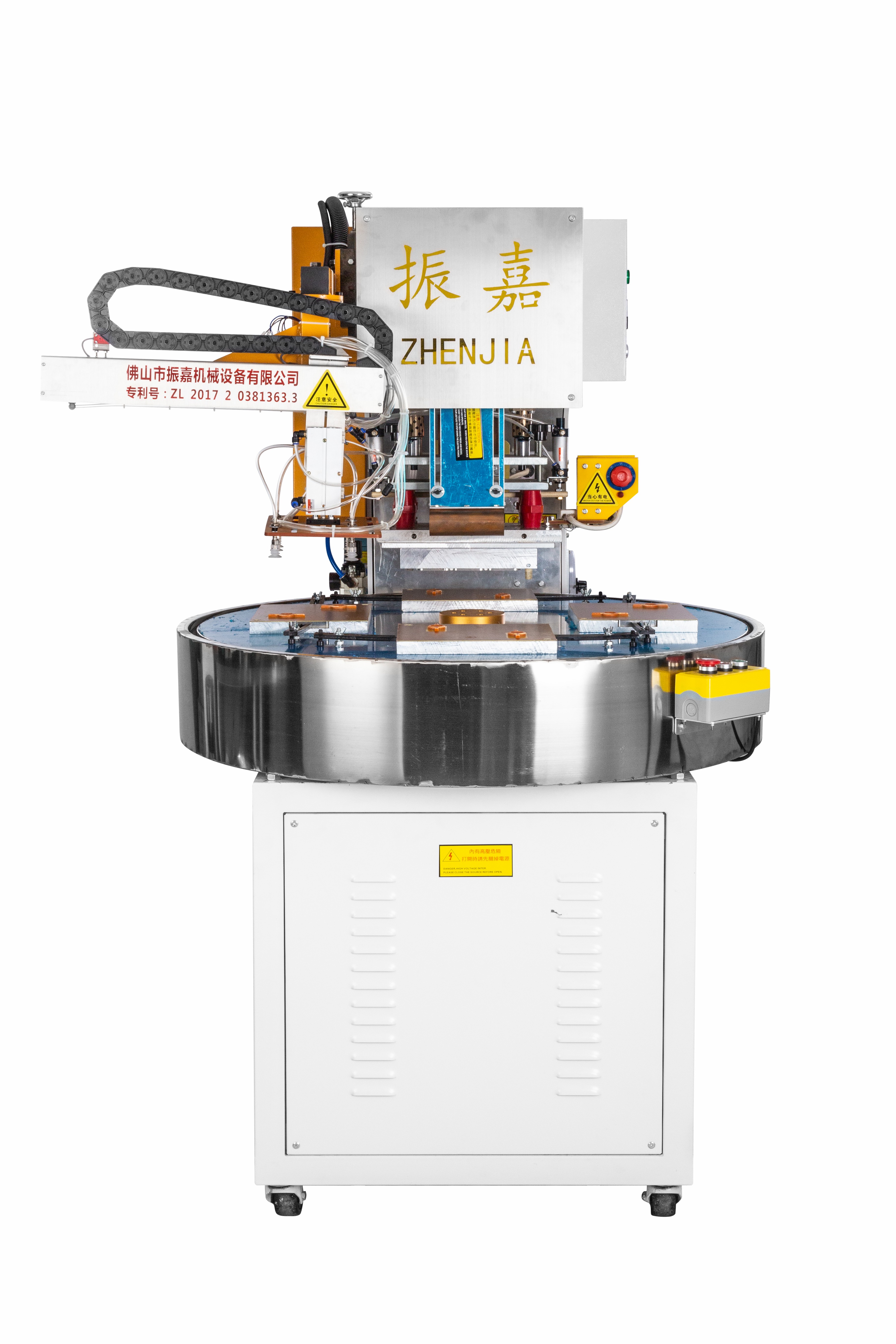 全自動圓盤高周波機設備型號為ZJ-8K-ADRB3,此機由振嘉高周波機械廠家專業生產,此機器質量已通過ISO機器質量認證;我司對客戶的樣板提供免費打板打樣,傳授產品生產整過程工序及提供生產方案。全自動圓盤高周波機設備 以圓盤360度旋轉,分為三個工作位,即每120度為一個工作位。圓盤裝有數字化變頻器,通過帶動電機控制圓盤轉動速度,數字化顯示可調節, 并配有PLC觸摸屏控制,簡單易懂,高效節能。